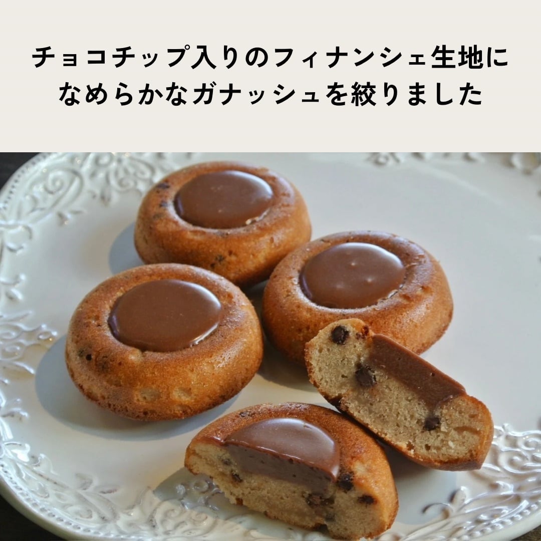 チョコチップ入りのフィナンシェ生地に、なめらかなガナッシュを絞りました。